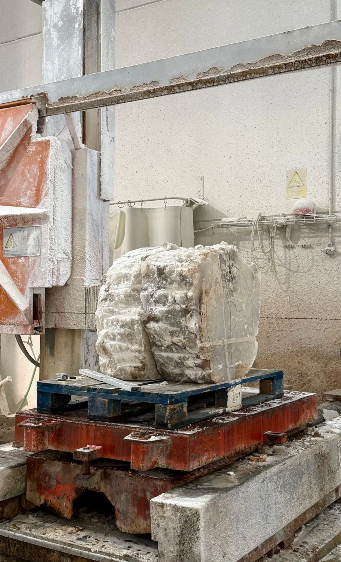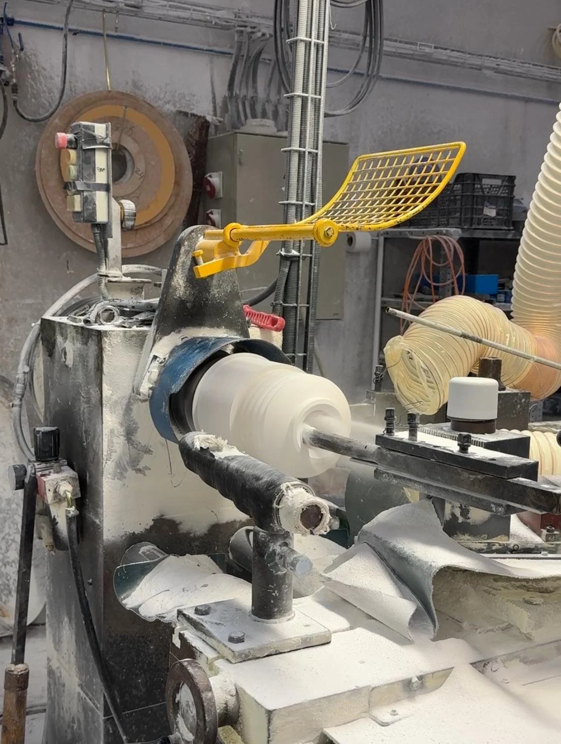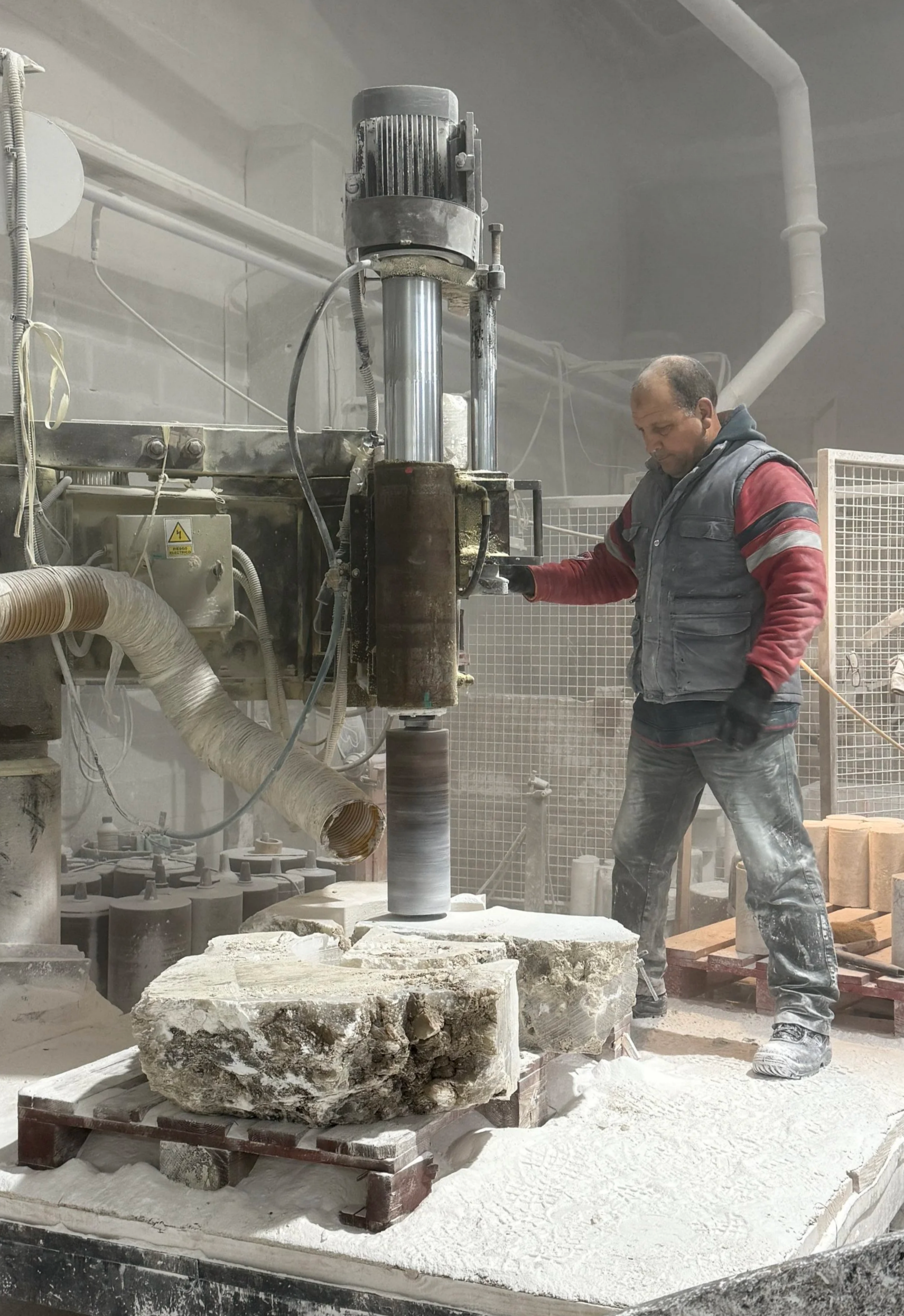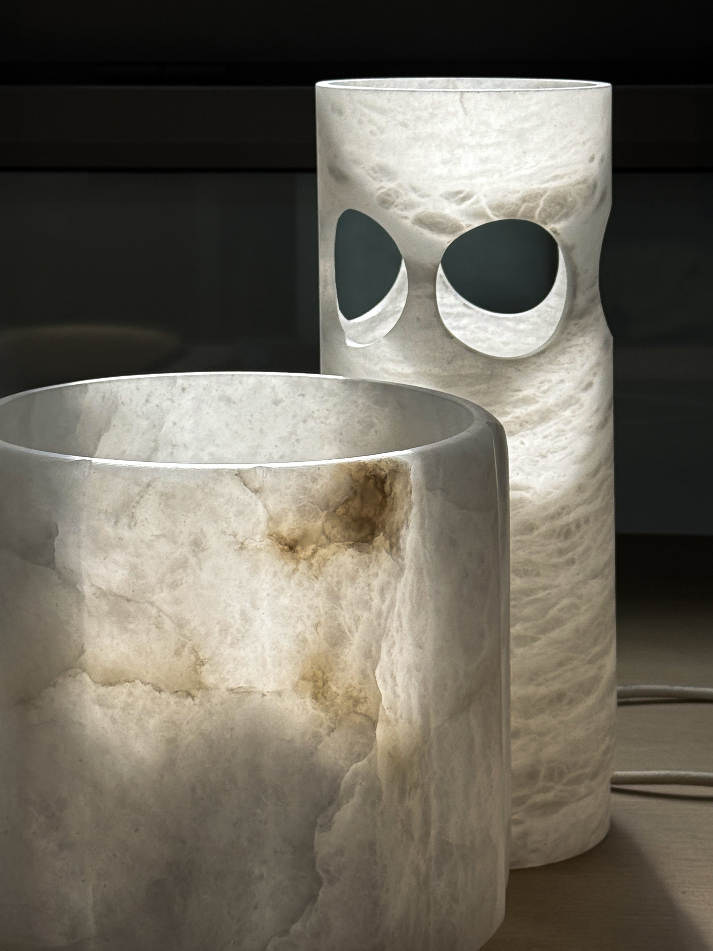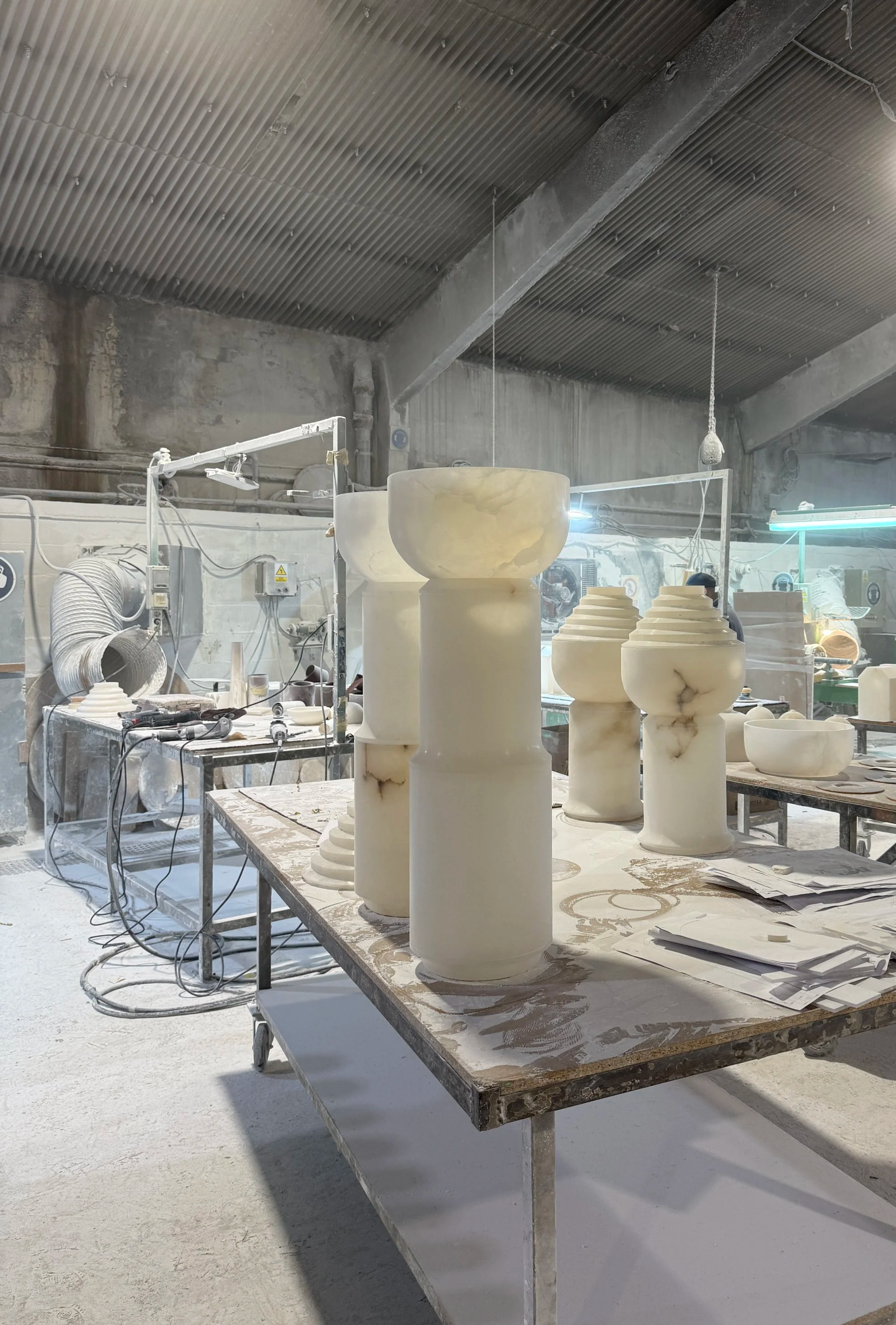 En découvrant ce matériau, Samuel a choisi de s’inscrire dans cette tradition tout en lui donnant une lecture contemporaine. Il s’est intéressé au travail au tour, procédé qui façonne la pierre par rotation et révèle progressivement ses qualités plastiques et lumineuses.